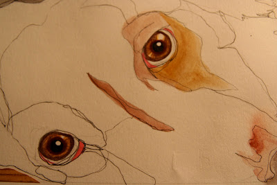 2:53 PMI'm pretty certain that my brother-in-law is not a frequent reader of Underbite, so I think it's safe to assume that I can show you his birthday present for this year. I've been slowly working on this piece for about 3 years now I think (it's done a lot of sitting under a pile of papers for the first pencil phase, then on my desk under clutter for the ink phase, and then moved about and around through various other phases until I decided that it was finally finished). So, for this year, Blake will finally get the finished artwork of Chloe and Bleu that I have been promising him for quite some time now.